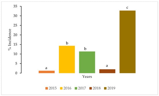 The varieties planted in the primary and secondary increase trials in 2015 had the lowest SCYLV incidence followed by the varieties planted in 2018 but the SCYLV incidence in 2015 and 2018 was not significantly (p < 0.05) different. Similarly, no significant difference in disease incidence was detected between 2016 and 2017. The percent SCYLV incidence was the highest in 2019 and was significantly (p < 0.05) higher than all three years (Figure 4).