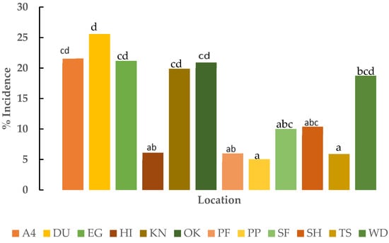 Percent incidence of sugarcane yellow leaf virus in varieties in the primary and secondary increase trials at different locations. Locations are Area 4 (A4), Duda (DU), Eastgate (EG), Hilliard (HI), Knight (KN), Okeelanta (OK), Pahokee Produce (PP), Perry Farm (PF), Shawnee (SH), South Florida (SF), Townsite (TS), and Wedgeworth (WD). Percent incidence values with different lower case letters are significantly different (p < 0.05).
