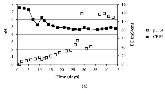 The experiments were carried out with continuous circulation of the acidic solution inside the membranes. The pH and EC values of the acidic solution are shown in Figure 8a,b for system S1 and system S2, respectively.