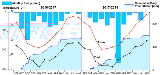 The rainfall and temperature parameters during the study period are shown in Figure 2. The precipitation amount recorded in each growing season was similar to the average of the last years (≈600 mm), with 550 mm throughout the first hydrological year (2016/2017) and 600 mm during the second (2017/2018).