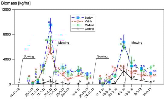 Biomass production of plant covers for each treatment during the two-monitoring seasons. Vertical bars represent standard error. Different letters in each sampling date are statically different based on the LSD test (p ≤ 0.05). X units follows the format DD-MM-YY.