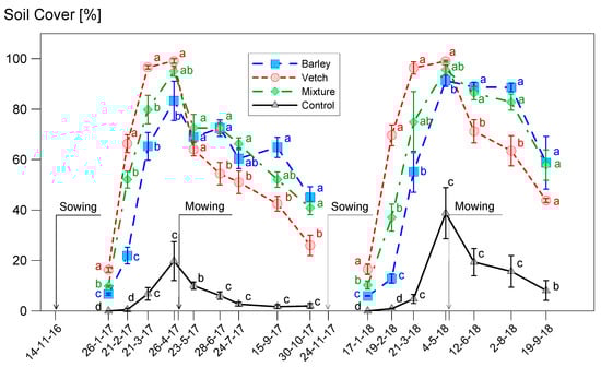 Degree of soil covered by cover crop treatments during the study period. Vertical bars represent standard error. Different letters in each measuring date are statically different based on the Least Significant Difference (LSD) test (p ≤ 0.05). X units follows the format DD-MM-YY.