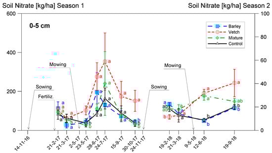 Soil nitrate content at 0–5 cm soil depth during the two-monitoring seasons. Vertical bars represent standard error. Different letters in each measuring date are statically different based on the LSD test (p ≤ 0.05). X units follows the format DD-MM-YY.