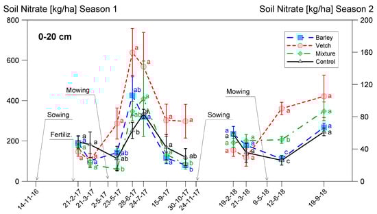 Soil nitrate content at 0–20 cm soil depth during the two-monitoring seasons. Vertical bars represent standard error. Different letters in each measuring date are statically different based on the LSD test (p ≤ 0.05). X units follows the format DD-MM-YY.
