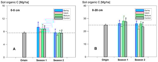 An increasing trend for SOC at topsoil horizon (0–5 cm) in the first season was determined and a decreasing in the second season, which continued lessening until similar values than those registered at the beginning of the experiment (Figure 7A). However, considering the entire 0–20 cm soil depth, the SOC in both barley and mixture plots reached more than 1.0 Mg ha−1 during the two-year monitoring seasons, in spite of not being found significant differences between plant cover treatments (Figure 7B). According to these results, annual rates of 0.5 Mg SOC ha−1 yr−1 could be assumed, representing a higher C sequestration annual rate than that proposed by “4 per Mille” initiative []. In this agreement, this arrangement was adopted at the COP21 with the aim of increasing the soil organic matter by 0.4% per year in order to mitigate the global emissions of greenhouses gases caused by human activities. Regarding the control plots, the biomass provided by the spontaneous vegetation was statistically similar to the remaining treatments. The absence of differences between treatments could be explained by different reasons. Thus, the lack of statistical differences shows that at least for a two-year monitoring period, it is difficult to reach relevant differences in terms of SOC (as has been observed in the present work). Hence, long-term experiences would be needed in order to verify any trends in organic C.