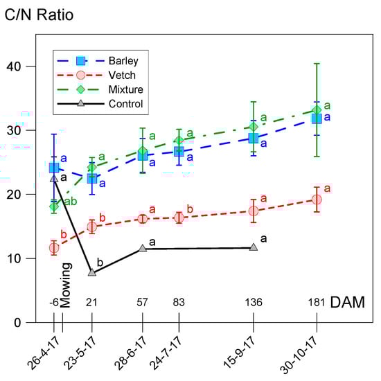 The C/N ratio dynamics throughout the decomposition process during the first season. Vertical bars represent standard error. Different letters in each measuring date are statically different based on the LSD test (p ≤ 0.05). No biomass samples from control plots in July and the last sampling date. DAM, days after mowing. X units follows the format DD-MM-YY.