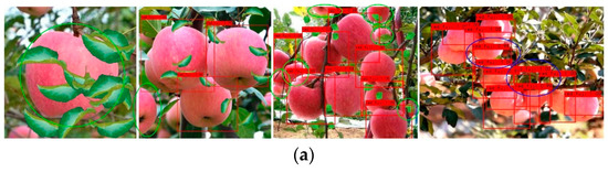 To further verify the influence of the proposed illustration data augmentation method on the improved model, as shown in Figure 10, the detection results of the model trained by the illustration augmented image are compared with the model trained by the real image. From the detection results, it can be seen that the model trained by the illustration augmented images and the model trained by the real images both can accurately detect apples under no occlusion between leaves. However, under the dense occlusion between leaves, the model trained by real images hardly detects apples, while the model trained by illustration augmented images can detect apples well and improve the detection results. It can be seen that the illustration augmentation method enriches the leaf occlusion scene in the training images, provides richer features for the learning of the model, and thus helps to improve the learning ability and detection results of the model.