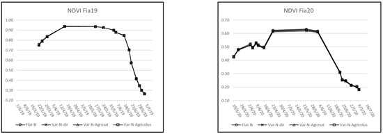 For Fia19, the NDVI time series analysis was performed by classifying plots according to three NDVI classes (NDVI ≤ 0.70; 0.70 < NDVI ≤ 0.77; NDVI > 0.77), as revealed by the S2 image from 22 March 2019 (Table 7, Figure 6). For Fia20, the NDVI time series analysis was performed by classifying plots according to three NDVI classes (NDVI ≤ 0.40; 0.40 < NDVI ≤ 0.44; NDVI > 0.44), as revealed by the S2 image from 19 March 2020 (Table 7, Figure 6). The differences in terms of yield were not significant in either field, while for the Fia20 field, the May 23 NDVI values of Var-N-Agricolus and Var-N-Agrosat were significantly different from Var-N-dir, but not from Flat-N.