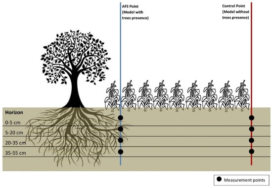 Specifically, the two different approaches followed in order to understand the impact of the presence of the trees in agrochemical pollution reduction were as follows: one run was done with crop-only (DSSAT 4.0-CSM 7000 maize was selected) and represents the control point (Figure 1) of our field experiments [], and one run with the crop and tree combination (DSSAT 4.0-CSM 7000 maize and modified crop Quick Tree 9506 olive trees were both included in the run), which represents the AFS situation (Figure 1), in line with the abovementioned field study. Field measurements were performed at both vertical sections. The model-proposed plant densities were considered equivalent to the actual pilot field plant densities. The field sampling and modeling rationale is also depicted in Figure 1.