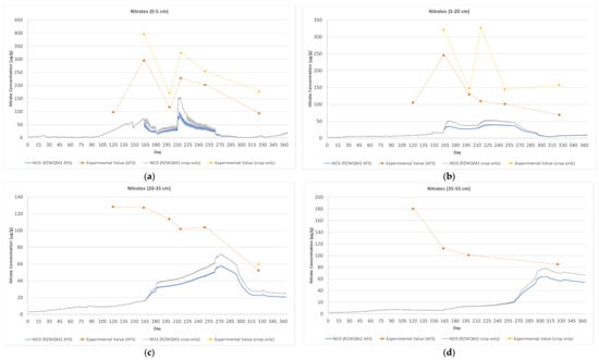 Accordingly, the fate and behavior of nitrates was better described for the crop-only system than the agroforestry system; however, the model still underestimated nitrate concentrations by 50%. Nevertheless, from a qualitative perspective (i.e., the behavior of the pollutants in the agricultural systems also with regards to the trend of time variation for the examined compounds), the compounds were well described. Comparison with field measurements was only done for 0–55 cm cores, as sampling in the deeper soil layers was not possible, due to soil compaction. It should be noted that the concentrations of nitrates in all soil layers during the crop season and at the end of the year were 20% and up to 60% higher in the crop-only system runs, compared to the AFS model runs.