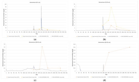 Regarding ammonium ions, as shown in Figure 3, the estimation of RZWQM2 was excellent in the topsoil layer and very good for the deeper layers, as the field results and model estimates were almost identical and matching, both in terms of concentration and in the behavior of the pollutant during the examined time-period. Ammonium mainly remained in the topsoil layer, both in the model run and the field experiment, with the highest concentrations present in the crop-only system. The difference between the maximum findings in the model runs was approx. 50% in the upper soil layers, which was also verified by the field results; however, there was no difference in the deeper soil layers (20–55 cm). As a general outcome, it can be considered that the model runs for ammonium were generally in line with the actual field findings for both crop systems. The residues of ammonium were almost zero at the end of the observation period, both in the field experiments and the corresponding model runs, implying that disappearance of the pollutant, via uptake or transformation into other forms of nitrogen, was appropriately estimated by the model in both cases.