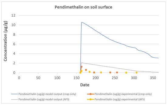 Concerning pesticides, according to the model predictions, pendimethalin, which is a very persistent compound, remained in the soil profile after the end of the modeled time period and its behavior did not significantly differ in the monocrop system (Figure 4). On the other hand, the remaining residues in the soil surface were much lower and almost reached zero (0.08 μg/g at the end of the modeled period) in the case of the agroforestry tree–crop system, compared to the monocrop scenario run, which exhibited residues of approx. 3 μg/g at the end of the model run period. The respective field findings during the first sampling campaign were approx. 0.17 μg/g in the topsoil sample at the control point (i.e., without the tree-root effect) and 0.04 μg/g in the AFS sampling point, whereas at both points the detected residues were below the experimental limit of quantification (LOQ) for the last sampling. As such, an overestimation of the pesticide levels was observed in the crop-only run, whereas a fair prediction was achieved for the AFS run. Pendimethalin’s environmental behavior, and particularly its decline, was also well described by the model for both system runs; however, in the case of crop-only, the residues at the end of the year were overestimated compared to the field measurements. It can be concluded that the model satisfactorily predicted the levels and the dissipation behavior of pendimethalin in the AFS model run; however, it overestimated the levels of the substance in the case of the crop-only run.