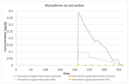 Accordingly, as presented in Figure 5, the nicosulfuron fate and behavior were also well represented in the modeled systems, with its disappearance in the agroforestry system being more rapid, and as such better corresponding to the field measurements. In more detail, from our field findings it could be seen that no residues were detected above the LOQ of 0.01 μg/g at any depth or sampling campaign after its application both at the AFS point and the control point (crop-only). As such, it is apparent that the main driving factor for nicosulfuron disappearance was the compound’s physicochemical properties and secondarily tree-crop uptake. In any case, the soil surface residues declined rapidly below the corresponding experimental LOQ in approx. 30 days in the tree-crop AFS run, which is consistent with our field findings. Therefore, nicosulfuron herbicide was generally well modeled, as both in the RZWQM2 predictions and in the respective field findings, it totally disappeared from both fields under consideration. In any case, a slight overestimation of the pesticide concentration could also be identified in this case, particularly in the crop-only system, as the decline rate estimated was slower than in the field experiment.