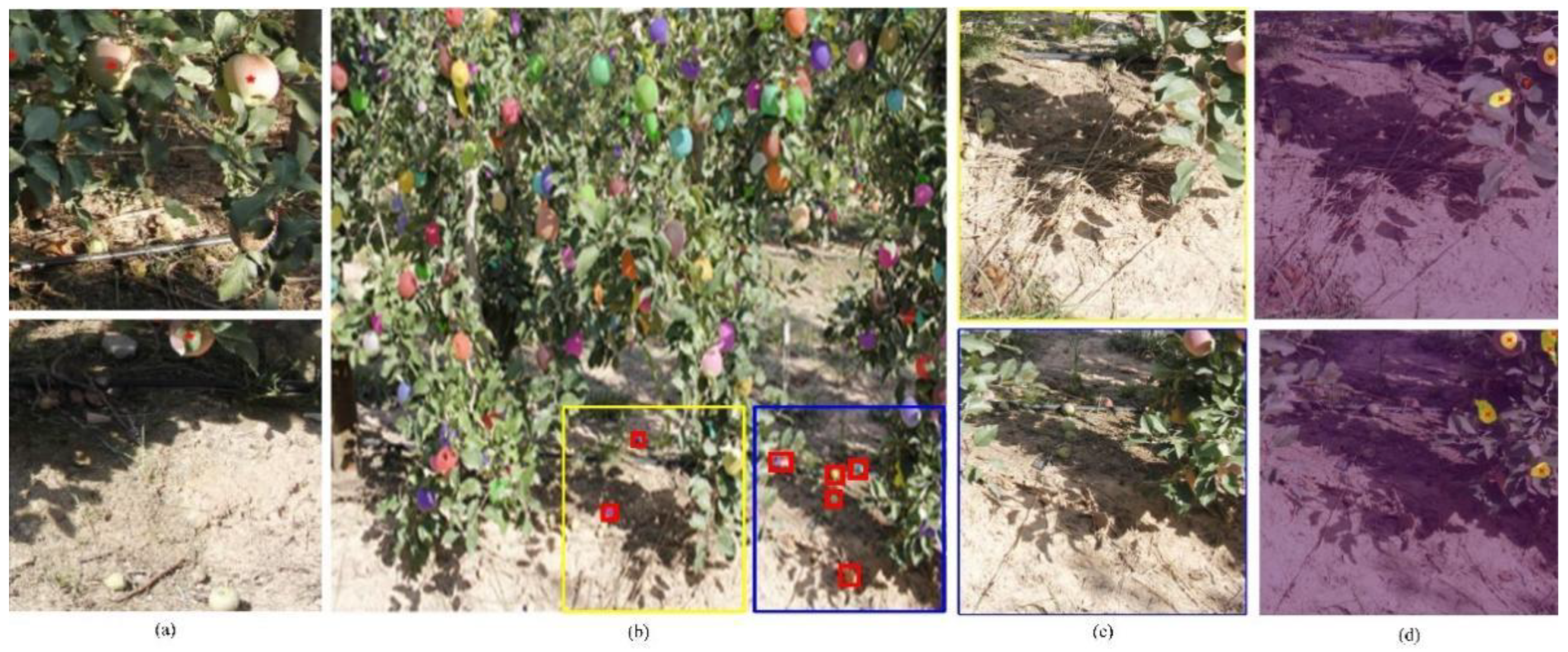 - Apples on the ground: Apples on the ground should not be included in the final yield or regarded as the picking target because they are not fresh. Hence, we provide examples in Figure 4 to show that our method can distinguish fruit on the branches from fruit on the ground. In the training set, apples on the ground were not considered annotation targets. Thus, our method clearly learns this better than Mask-RCNN.