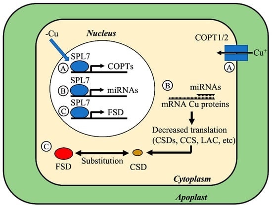 AtSPL7 directly regulates several genes important for the so-called “Cu economy response”, in which plants become more efficient in saving Cu for essential proteins, such as plastocyanin, while switching off non-essential ones (Figure 1). For that, AtSPL7 binds to Cu responsive elements (CuRE), which are found in several Cu deficiency-regulated genes [,,]. Among the well-established targets are the primary root uptake transporters of the COPT gene family (see below), which likely perform primary Cu uptake from rhizosphere; ferric superoxide dismutase (FeSOD), which can perform similar role as Cu/ZnSODs but using Fe as a cofactor, therefore saving Cu for essential functions; and a set of microRNAs (397, 398, 408, and 857) which down-regulate the expression of cupric proteins, such as Cu/ZnSOD, Cu chaperones (such as CCS, which delivers Cu to Cu/ZnSODs), laccases, plantacyanin, and others [,,,]. MicroRNAs 397, 398, and 408 are well conserved in plants, as well as their potential targets, suggesting conservation of this regulatory network, which can work as a diffusible signal between symplastically connected cells to adjust Cu usage []. Interestingly, the Cu economy response seems to be at least partially conserved in rice plants [], besides the fact that no ortholog to AtSPL7 is described in rice to date.