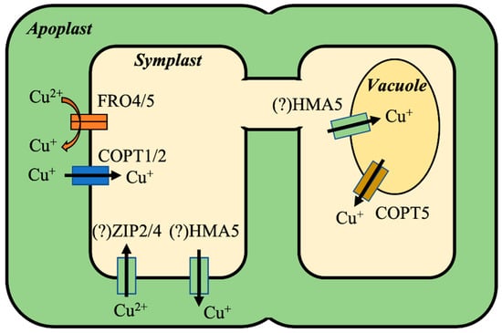 Early works in A. thaliana have proposed that two proteins from the ZIP (Zinc-regulated/Iron-regulated Protein) transporter family, AtZIP2 and AtZIP4, could use Cu as a substrate []. Both genes are regulated by Cu availability in A. thaliana, with AtZIP2 being up-regulated, although there are some contradictory results in the literature regarding its regulation by Cu deficiency and excess [,,,]. In any case, it is still an open question whether AtZIP2/AtZIP4 are involved in Cu root uptake (Figure 2). A similar regulation at the transcriptional level was observed in orthologous genes in Vitis vinifera [], which suggests these ZIP transporters might have a role in Cu homeostasis. It is important to highlight that the ability to transport Cu is still lacking confirmation, as no ZIP transporter was shown to use Cu as a substrate to date. Therefore, the physiological role of this gene family in Cu homeostasis is still unclear.