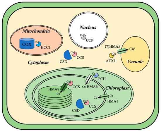 The transition metal copper (Cu) is essential for most living organisms, including higher plants [,]. Under physiological conditions, Cu is found in two forms, the reduced Cu+ state (cuprous) and the oxidized Cu2+ state (cupric) []. Depending on the state, Cu can bind different substrates [,], from sulfur-containing compounds having a thiol or a thioether group to oxygen or imidazole nitrogen groups [,]. Such dual chemistry of Cu allows the interaction with several molecules [], especially enzymes that catalyze redox reactions, driving a myriad of biochemical pathways [,,]. On the other hand, the redox capacity of Cu can directly lead to the generation of ROS (reactive oxygen species) through Fenton and Haber–Weiss reactions, causing severe damages to proteins, DNA, and other biomolecules [,,,,]. Besides being essential in small amounts to ensure cellular functions, Cu excess may exert detrimental effects on plant primary production and even survival [,,]. Therefore, it is essential for a plant to have a strictly controlled Cu homeostasis [,,].