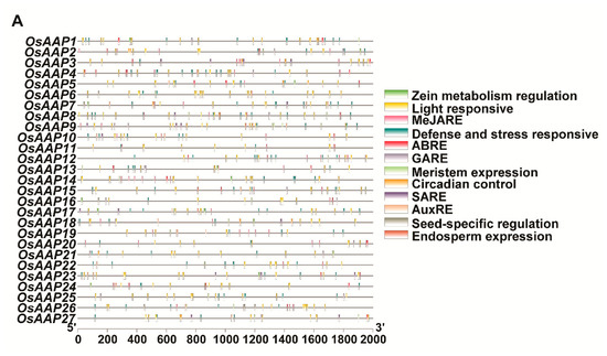 To better understand the potential functions of the OsAAP family genes, we utilized the PlantCARE online web server to examine the 2000 bp upstream sequences of these genes. This analysis unveiled a multitude of cis-regulatory elements encompassing aspects such as phytohormone responses, light sensitivity, circadian rhythm modulation, seed-specific regulation, and defense and stress responsiveness (Figure 8A,B).