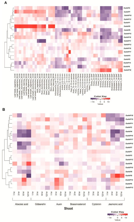 The expression patterns of OsAAP family genes were examined in various tissues, developmental stages, and in response to hormone treatments, aiming to elucidate their roles. The expression values for the OsAAP gene family were obtained from the Rice Expression Profile Database (RiceXPro) and were subsequently employed to construct heatmaps. Notably, a total of 27 OsAAP showed differential expression in different tissues, developmental stages, and hormone treatments, as illustrated in Figure 9A–C.