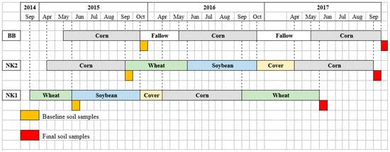 Baseline soil samples were taken in 2015 on a whole-plot basis at both locations, immediately after allocating the wheat straw treatments in NK1 (mid-June), and the corn stover treatments in NK2 (mid-September) and BB location (mid-October) (yellow boxes at the bottom of each timeline rotation in Figure 1). At this time, six and eleven intact soil cores were taken at three randomly chosen sites at the BB location (i.e., about half the size of each experiment in NK) and at each experiment in the NK location, respectively, from non-trafficked interrow, to a depth of 15-cm.