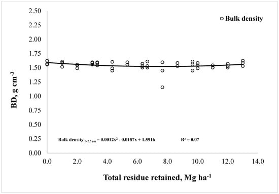 Bulk density (BD) was not affected by corn stover (p > 0.19) or total residue retention rates (p > 0.51) at any soil depth in Blacksburg or NK2, respectively. In NK1, total residues retained affected BD in the 0–2.5 (p = 0.097) (Table 4; Figure 3) but not in the 2.5–7.5 (p = 0.796) or the 7.5–20 cm (p = 0.611) depths (Table 4). When differences were significant at the 0–2.5 cm depth in NK1, the calculated minimum point in the regression curve corresponded to a total residue retained rate (x-axis) of 7.79 Mg ha−1 (approximately 60% retention rate). Predicted BD response (y-axis) at this minimum total retained rate in 2017 was 1.52 g cm−3. As a result, BD at the 0–2.5 cm depth gradually decreased with increasing residue retention of up to total retention rates around 60% to further increase when more than 60% of the total residue was retained (Figure 3). However, significant differences in BD do not seem to be biologically or environmentally meaningful in the top 2.5 cm soil in NK1. The best fitting line for the quadratic model had a seemingly flat shape across the range of predicted values for the total retained treatments (Figure 3). In fact, the range between the minimum and maximum predicted values across the sixteen treatments was less than 5% (Figure 3). Similar to our results in loams (BB) and sandy loam (NK) soils, retention of up to 150% residue over an eight-year period did not affect BD in the upper 7.5 cm of silty clay loam soils in measurements taken two [] and nine years [] after residue-treatment completion in studies conducted in Nebraska. In other studies, 100% of corn stover retention did not affect BD in the first 20 cm in Québec [] or 50 cm of soil in Iowa [], but reduced BD in the first 15-cm, compared with 0% retention, in other short [] and long-term studies [,].