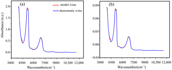 The NIR spectral signals of the wine with added Rose Oxide are shown in Figure 1. The red curves expressed the model wine, and the blue curves expressed the de-aromatic wine. It could be observed that the different matrix backgrounds exerted a considerable effect on the height and width of the peaks in the curves, but they had little effect on the position of the peaks.
