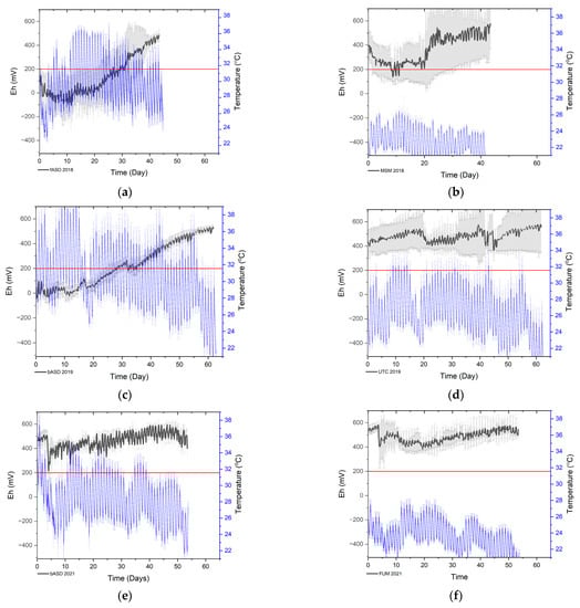 The redox potential (Eh) and temperature of all of the ASD-treated replicates show that results varied somewhat between replicates but significantly between trials. The red line indicates the target Eh threshold for anaerobic soil conditions. (a) The fASD trial at the UCSC-CfA was aerobic by day 30 across all plots and was significantly warmer than (b) the MSM. The bASD PSI 2019 trial (c) became also aerobic after 30 days and was also significantly warmer than the UTC (d). However, the PSI 2021 bASD trial (e) was only anaerobic for a short period (~24 h); there was no difference in Eh compared to the FUM in 2021 (f). All comparisons between the ASD treatments across all three trials were significantly different in temperature with PSI2019 being the warmest but most variable at 30.5 °C ± 3.8 °C, and PSI 2021 being the coolest at 28.2 °C ± 2.7 °C.
