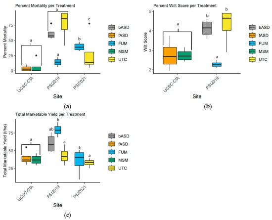 (a) Both treatments at UCSC-CfA (fASD and MSM) had significantly lower mortality than all other treatments with the exception of the fumigated treatment in the 2019 trial; although, we cannot separate the effect of treatment from site. The mortality of UTC was likely most influenced by the strawberry variety with Fusarium wilt-susceptible Albion in 2019 seeing high mortality and Fusarium wilt-resistant San Andreas seeing much lower mortality in 2021. (b) Wilt score followed a similar trend to mortality with reduced wilt overall at UCSC-CfA and in the FUM treatment, but not in the bASD and UTC treatments. Wilt score was not collected for PSI 2021 because the grower changed the strawberry variety from Albion to San Andreas. (c) Cumulative marketable yield of strawberries harvested from the crops grown after ASD was measured for each treatment at both sites and compared with the cumulative yield of strawberries in t/ha−1 at the UCSC-CfA. There was only a marginal difference in yield between the fASD and MSM at UCSC-CfA. At PSI 2019, bASD was noticeably less successful with reduced yield in all ASD plots compared to FUM. FUM had a significantly higher yield than the UTC with bASD having no significant difference between either the FUM or UTC. The yield results for the PSI 2021 are reported but there was no difference between treatments as Fusarium wilt-resistant varieties were planted in the non-FUM treatments. Significant differences between treatments are indicated by lower case letters with same letters indicating no differences.