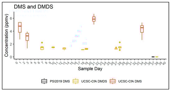 DMS and DMDS were detected repeatedly during the fASD trial. DMS and DMDS were never detected from the mustard seed cake control, so were not reported. DMDS was notably absent from the PSI 2019 trial. DMS was only detected once at very low concentrations during the entire ASD treatment period.