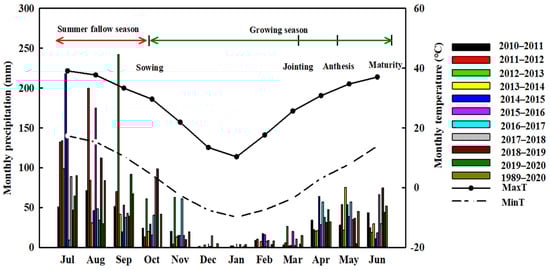 Field experiments were conducted throughout the dryland wheat growing season from 2019 to 2021 at Experimental Station Wenxi, Shanxi Agricultural, situated in Wenxi County (34°35′ N; 110°15′ E), Province of Shanxi, China. The location is characterized by the semi-arid climate of the northeast Loess Plateau region, with a normal annual ambient temperature of 11–13 °C and an annual rainfall of 335.0–671.30 mm (2011–2019). The region lies between 450 and 700 m above level of sea, and the annual rainfall tends to increase from July through September.