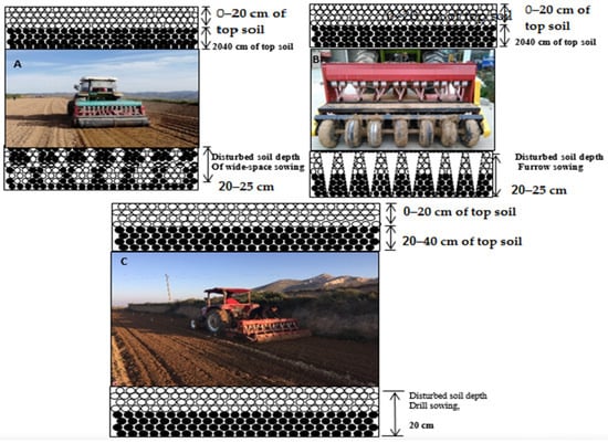 This technique has been widely used in the upland wheat areas of Henan, Shaanxi, and Shanxi []. Sowing in imitation of the terrain, applying fertilizer, and crushing after sowing were completed at one time, so as to achieve zero connection between plowing and sowing and improve the efficiency of operating the agricultural machinery and the comparative benefit of the wheat production. Wide-space sowing technology has been widely used in Shandong, Hebei, Henan, and other places and has been introduced to the Loess Plateau region in recent years, although it is still in the improvement stage of adapting to local conditions [].