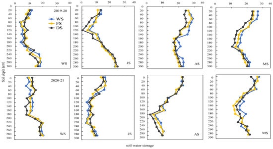 Effects of sowing methods on changes in the soil water storage amount in the different soil layers at the different growth stages in dryland wheat. WS, JS, AS, and MS indicate the wintering stage, jointing stage, anthesis stage, and maturity stage.