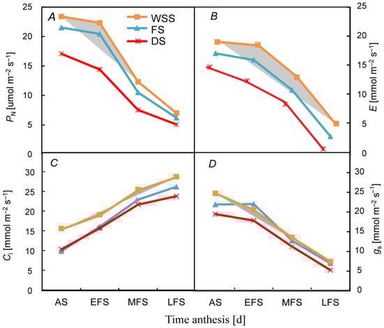 The net photosynthetic rate of flag leaves is shown in Figure 4A. There was a great decrease from the early to central grain-filling stage. The net photosynthetic rate of the drill sowing treatment was significantly lower compared to other treatments, e.g., about 44% lower than wide-space sowing and 34% lower than furrow sowing. The decreasing trend of the transpiration rate was not apparent at the early stage of grain filling. Still, it was consistent with the changing trend of the net photosynthetic rate from the early stage to the late stage, and it decreased significantly (Figure 4B). The results showed that the flag leaves had an obvious water demand and strong transpiration after grout. The intercellular CO2 attention was the highest under WSS and DS at different stages after anasturation, which was 22% higher than that of drill sowing, 8% higher than that of drill sowing at the initial, middle, and late stage of grain filling, and 7% higher than that of drill sowing at the middle and late stage of grain filling, respectively (Figure 4C). With the growth process of winter wheat after flowering, the stomatal conductance of flag leaf decreased significantly from the early to the middle filling stage (Figure 4D). Different sowing methods can improve the stomatal conductance of flag leaves after flowering, especially promoting the end of grain filling. Wide-space sowing and drill sowing performed best except at the initial stage.