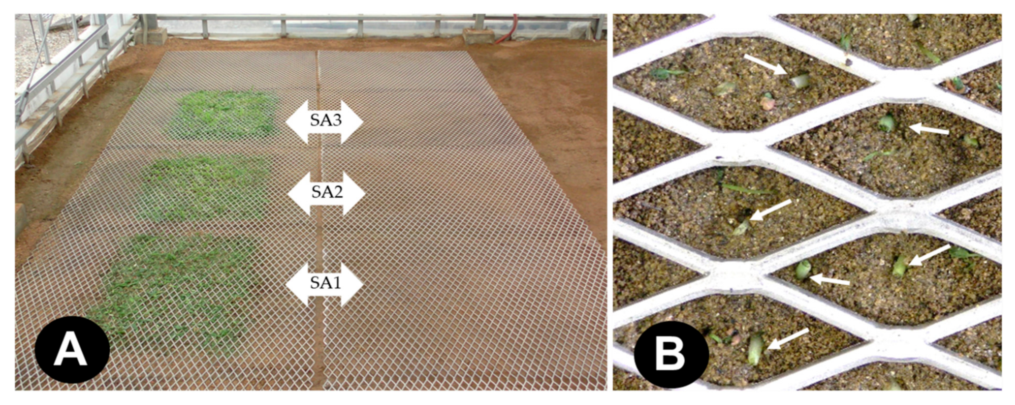 3.3.2. Greenhouse Assay for Controlling Floor Weeds by the UEW