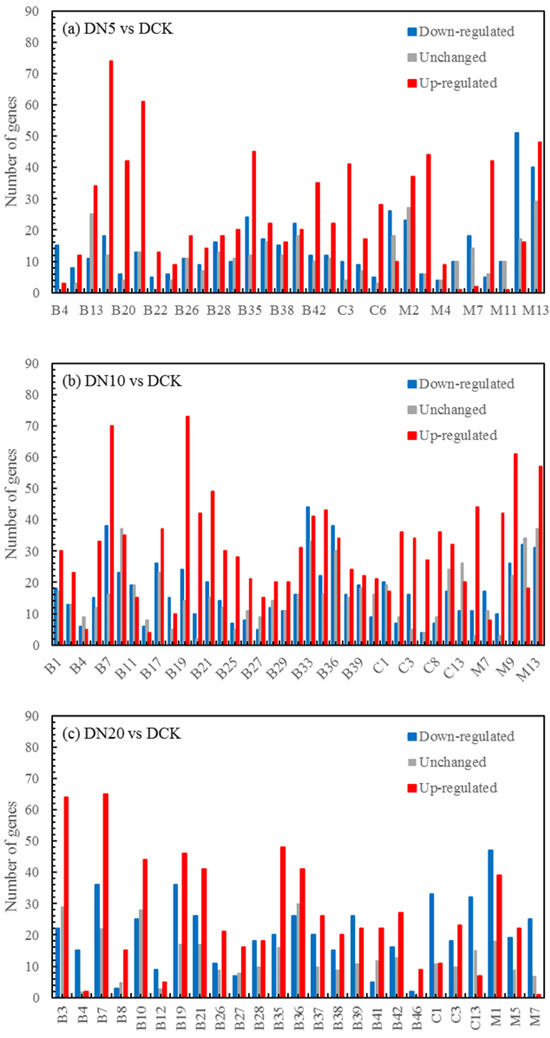 The differential expression analysis focuses on identifying genes that are differentially expressed (DEGs) between samples and subsequently functionally analyzing these genes. Based on the criteria of |log2(fold change)| ≥ 1 and FDR < 0.05 for significant DEGs, our results revealed a total of 58,852, 60,711, and 58,566 significantly differentially expressed genes between DN5, DN10, and DN20 compared to DCK, respectively (Figure 2a–c). Additionally, we observed a significant differential expression in 57,070, 57,473, and 59,529 genes between DO5, DO10, and DO20 compared to DCK, respectively (Figure 2d–f).