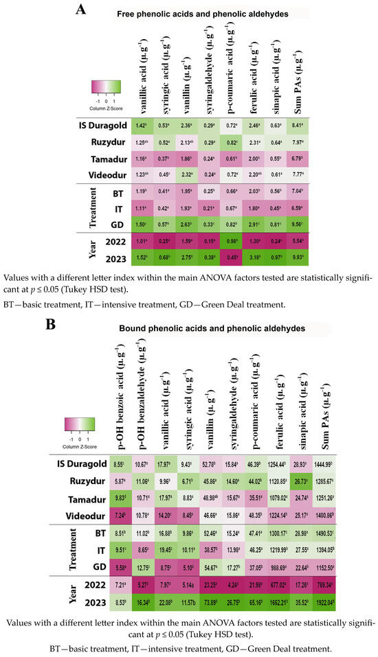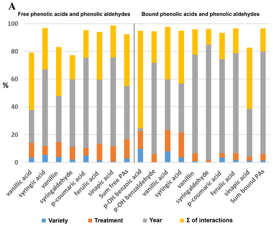 The results of our study indicate that the year was the most significant factor affecting the variability of the sum of the free (38%) and the bound PAAs (74%), followed by treatment intensity (IT) and, to a much lesser extent, the variety factor. The highest inter-annual dependence was observed for syringaldehyde (83%) among the bound phenolic acids and p-coumaric acid (65%) among the free phenolic acids. In contrast, the influence of the year was notably minimal (approximately 2%) for bound p-OH benzoic acid, with a considerable proportion of total variability attributed to the sum of interactions (71%) (see Figure 3A).