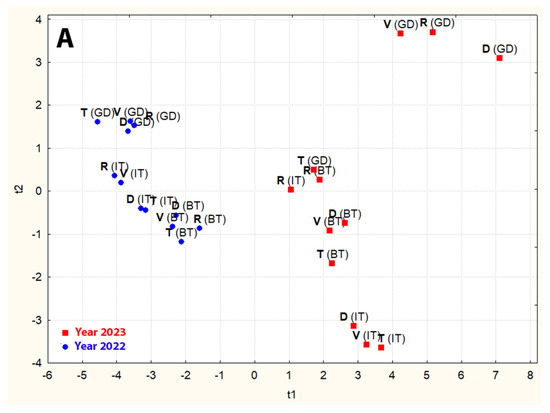 PCA score plots for tested combinations of durum wheat samples based on the variability of PAAs (A) and other parameters (B). BT—basic treatment, IT—intensive treatment, GD—Green Deal treatment, D—Duragold, R—Ruzydur, T—Tamadur, V—Videodur.