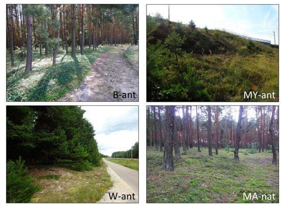 The material for the control sample was obtained from a natural (nat) site in a pine forest near Małogoszcz (MA-nat), (N 50°48′07″; E 20°14′14″), southern Poland. This was an area located several kilometers away from both road and rail communication routes.