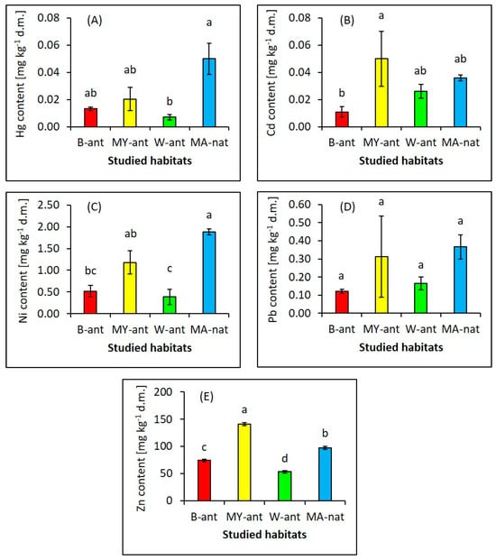 The highest content of heavy metals (Cd, Hg, Ni, Pb, and Zn) was detected in the samples collected from individuals growing in the (MA-nat) sites. Except for Cd, the differences were significant (Table 2).
