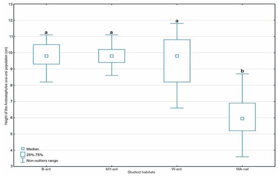 The comparison of the height of the A. uva-ursi population in the studied vegetation patches followed by the post hoc Dunn–Bonferroni test. The same letters indicate no statistical differences, p < 0.05.