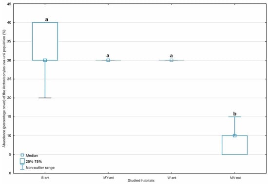 The comparison of the abundance (percentage cover) of the A. uva-ursi population in the studied vegetation patches followed by the post hoc Dunn–Bonferroni test. The same letters indicate no statistical differences, p < 0.05.