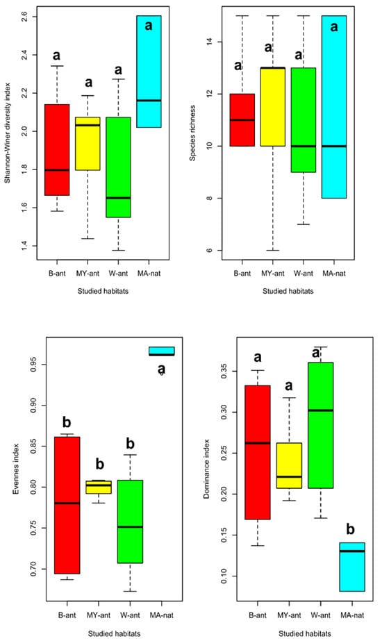 The comparison of the diversity indices in vegetation patches in which the studied A. uva-ursi population occurs. The same letters indicate no statistical differences.