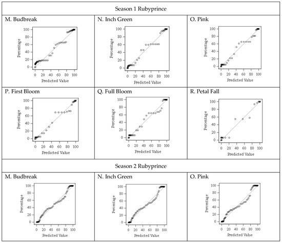 The sigmoidal trend for the percentage floral bud progression over time was fitted using a logistic adjustment. The logistic model and three different parameters were used to estimate the percentage values for floral bud progression. Evaluation of the model was performed using the statistics of root mean square error (RMSE) and a 1:1 line of observed vs. predicted values for each stage, cultivar, and season. As an example, the 1:1 line is presented in Figure 3 for all stages of the ‘Rubyprince’ cultivar. The graphs for ‘Harvester’ and ‘Red Globe’ cultivars for both seasons are listed in Appendix A. The RMSE varied between 0.375% and 0.620% for the floral bud progression for season 1 and between 0.429% and 0.647% for season 2 (Table 2). The statistics indicated a good fit for both seasons and the overall evaluation ensured that the simulated values were within an acceptable range of the observed data. The models had a significant p-value (<0.0001).