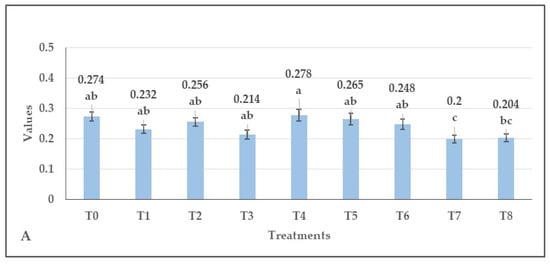 Figure 11 illustrates the seed yield contamination obtained after treatments (calculated into kg ha−1). The highest seed contamination was separated from the yield of clomazone-treated (T5) plots (22.2 kg ha−1), although one plot in the pendimethalin (T2) treatment had exceptionally high plant contamination (42.3 kg ha−1). The least contamination was obtained in the seed yield harvested from the T8 treatment (7.5 kg ha−1), whereas the seed yield from control plots contained 16.5 kg ha−1 contamination. Box plots of the dataset show the data distribution in Figure S7.