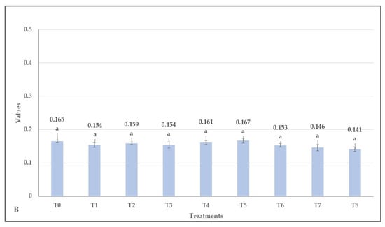 Based on the weed survey results, metobromuron (T6) was the least effective against weeds in the experimental area (Figure 8); however, it did not differ from the control (T0), pethoxamid (T4), clomazone (T5), and imazamox (T8). The active substance dimethenamid-P (T3) was the most effective for weed suppression, followed by the metribuzin (T7) and then the flumioxazin (T1) treatments, resulting in significantly lower results than the majority of other treatments (F(8, 68.5) = 25.4, p < 0.001). Box plots of the dataset show the data distribution and significant differences at three levels in Figure S5.