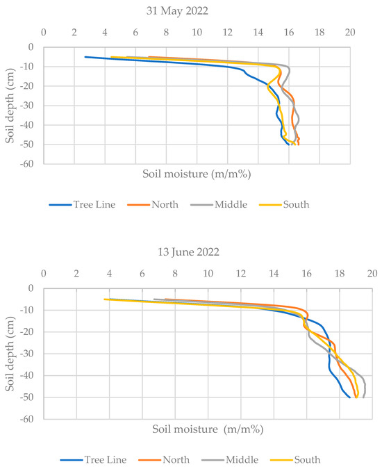 Soil moisture was measured three times, each time 6–7 days after irrigation. At the first measurement date, the soil moisture in the fasciculus at a depth of 5–18 cm was lower than that measured in the intercrop soil. At the same time, the higher water use of the trees did not extend horizontally to the northern and southern strips (~1.5 m from the tree line) of red clover soil. In all strips, similar soil moisture levels were measured throughout the soil profile. The second measurement date was preceded by 90 mm irrigation. Neither the orientation nor the tree line had any effect on the soil moisture, as the curves of the mean values seem to confirm. At the third time of measurement, it can again be seen that the different strips had similar moisture contents, but in the 7–15 cm soil layer, the higher water use of the willows is reflected in the lower soil moisture values (Figure 5).