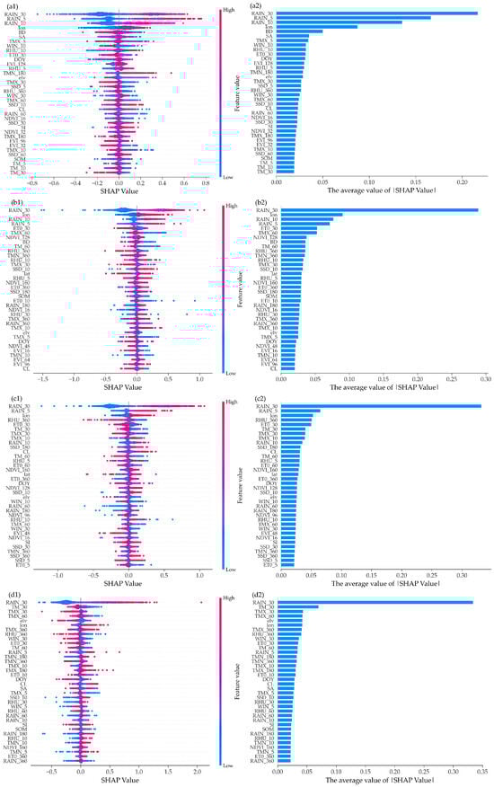 The importance ranking of the top 36 features in the estimation model for pre-sowing soil moisture, constructed using the Random Forest Regressor (RF) models at soil depths of 0.1 m (a), 0.2 m (b), 0.3 m (c), 0.4 m (d), 0.5 m (e), 0.6 m (f), 0.8 m (g), and 1.0 m (h). (a1–h1) illustrates the distribution of SHAP values of different value variations in inputs across the features. (a2–h2) illustrates the SHAP values ranking of the features within the RF.