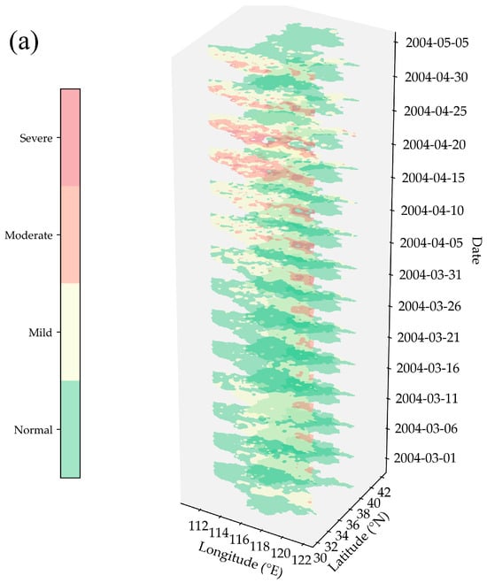 Drought conditions affecting wheat crops frequently occur during the spring season. The critical water requirement stages for winter wheat occur from March to May, during which the wheat transitions from the jointing to the booting stages [61,88]. This period is characterized by inadequate precipitation and uneven rainfall distribution, which is prone to lead to insufficient soil moisture, thereby negatively affecting the normal growth and yield formation of winter wheat [79,89,90]. A notable instance of regional drought affecting winter wheat was observed between March and May of 2004, serving as a representative spring drought case for evaluating hybrid drought monitoring systems. According to the Yearbook of Meteorological Disasters in China (2005) [91], the majority of areas within the HHH region experienced extended periods of low precipitation and snowfall from 1 March to 24 April 2004. Concurrently, temperatures remained elevated, resulting in decreased soil moisture and an expansion of drought conditions, with some regions classified as experiencing moderate to severe drought, which significantly hindered the growth and development of winter wheat. Following 24 April and into early May, multiple substantial precipitation events occurred in the central and eastern regions of China, leading to a considerable improvement in soil moisture across most areas of HHH and alleviating drought conditions. However, varying degrees of drought persisted in the central portion of the southern HHH region. Figure 5a illustrates the spatial evolution of drought in the HHH region, as identified by the hybrid drought monitoring system, under rain-fed conditions from 1 March to 5 May 2004. The findings indicated that the extent of drought began to expand from 1 March; however, some alleviation was observed in mid to late March, which was corroborated by meteorological data indicating precipitation in the southern part of the HHH region, albeit with overall low rainfall levels. Following late March, the area affected by drought continued to expand, reaching moderate to severe levels in some regions. Beginning on 25 April, a gradual alleviation of drought conditions was noted as a result of precipitation, yet by 5 May, drought impacts were still evident in the central part of the southern HHH region. Overall, the evolution process of this typical spring drought, as deduced from the monitoring system, exhibited a significant consistency with historical records of actual disaster events.