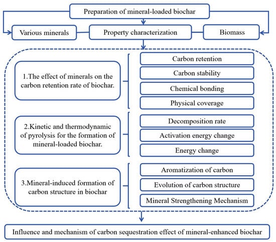This study selected common biomass species, phragmites and goldenrod, collected from Chong Ming Island in Shanghai, China, because both phragmites and goldenrod had high annual carbon sequestration rates. Clay minerals are widely available in nature, with a low cost. Since elements such as Fe, Ca, and Mg are naturally present, the stable minerals generated after pyrolysis are less likely to dissolve in natural water bodies, thereby minimizing the potential for secondary environmental pollution. In addition, in order to reveal the pyrolysis mechanism, hemicellulose, cellulose, and lignin were also used to produce biochar. The basic properties of all biochars are shown in Table 1. After air-drying, the phragmites and goldenrod were broken and passed through a 2 mm sieve. Then, the phragmites or goldenrod was impregnated in solutions containing metal salts (CaCl2, Ca(H2PO4)2, MgCl2, FeCl3) or minerals (quartz, goethite, bentonite, albite) with the ratio of 1:5 (mineral/biomass, w/w) []. The chemicals were bought from Shanghai Sinopharm company, China. The mixture was stirred and dried at 80 °C to remove moisture. A block diagram of the content of this study is shown in Figure 1.