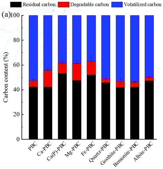 After K2Cr2O7 oxidation, the content of degradable carbon in modified biochars loaded with Ca(H2PO4)2 and FeCl3 (8.4–10.8%) were higher than that in original biochar (5.2% for PBC, and 6.9% for GBC) (Figure 2). In contrast, the degradable carbon content in biochars loaded with CaCl2 and MgCl2 reached up to 13.4–14.9%, suggesting that degradable carbon retained by soluble salts during pyrolysis was lost after K2Cr2O7 oxidation. Nan et al. [] reported that doping with CaCl2 induced the formation of degradable carbon structure. Biochars loaded with Ca(H2PO4)2 exhibited the highest proportion of residual carbon. Compared to the original biochar, the residual carbon in Ca(P)-PBC increased from 42.3% to 53.1%, and in Ca(P)-GBC, it increased from 38.1% to 52.1%. Li et al. [] reported that during pyrolysis, Ca(H2PO4)2 interacted with cellulose, hemicellulose, and lignin to form thermally stable phosphorus complexes, which hindered carbon decomposition and prevented active carbon sites from undergoing K2Cr2O7 oxidation, thereby enhancing carbon stability. As for quartz, goethite, bentonite, and albite, they were not effective in increasing the residual carbon rate of biochar. Previous studies reported that alkali metals (K, Na) exhibited stronger catalytic cracking effects, compared to alkaline earth metals (Mg, Ca), resulting in the production of a greater quantity of low molecular weight species. Furthermore, during the pyrolysis process, a significant portion of Mg and Ca remained in the solid products, while K and Na were markedly transferred into volatile fractions []. These minerals differed in their ability to enhance the stability of carbon in biochar, indicating that the interaction mechanisms between these minerals and carbon in biochar. Nan et al. [] investigated the pyrolysis of cellulose loaded with CaCl2 and found that Ca2+ promoted the formation of unsaturated structures while inhibiting the cleavage of glycosidic bonds, thereby facilitating the condensation of unstable solid components. In contrast, relatively reactive elements such as K and Na in soil minerals directly formed organometallic complexes with carbon during pyrolysis, further hindering aromatization []. Additionally, some minerals that diffused into the interior of biochar altered the functional groups of the side chains, leading to differences in the reactivity of biochar [].
